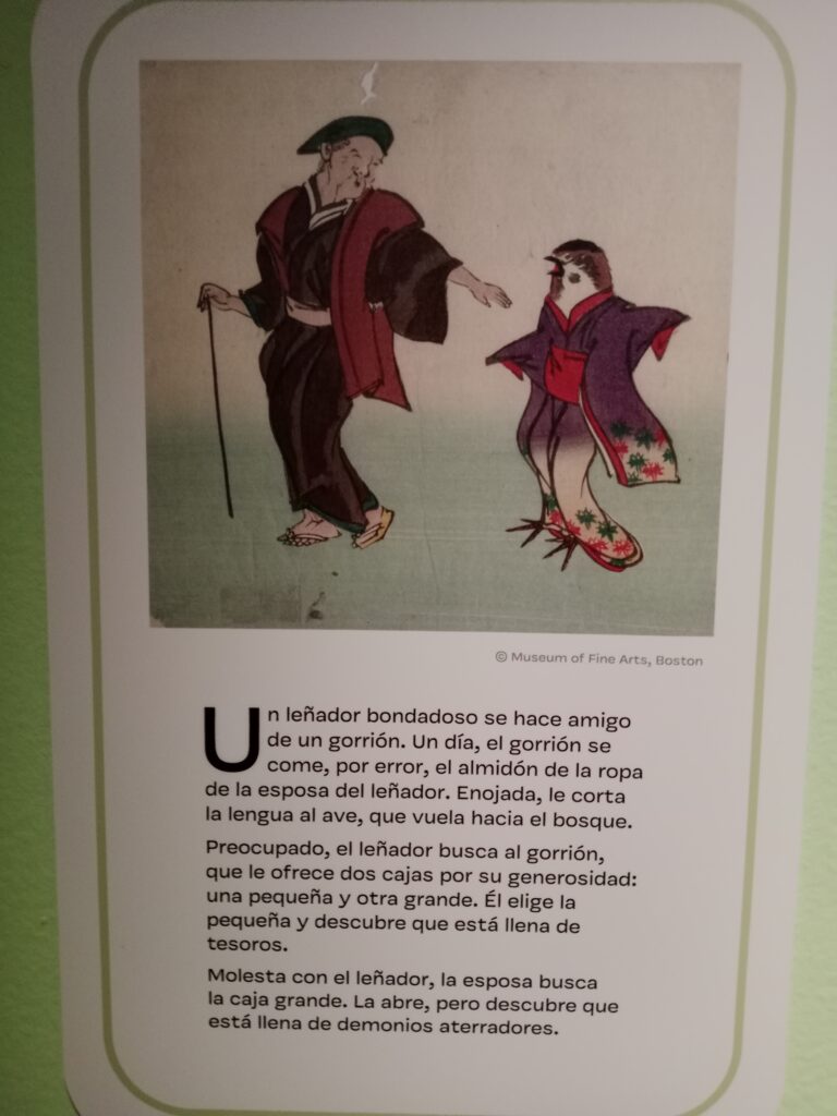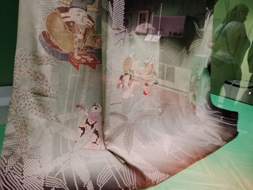En el 裾 (suso, parte inferior del kimono) se narra de forma bellísima, con pintura y bordado, el cuento del “Gorrión de lengua cortada”. Aunque hay varias versiones de este cuento, esta es la que está en el museo (no sé porqué me acordé de mi ex suegra, maldita perra -espero que también encuentre puras desgracias-).
