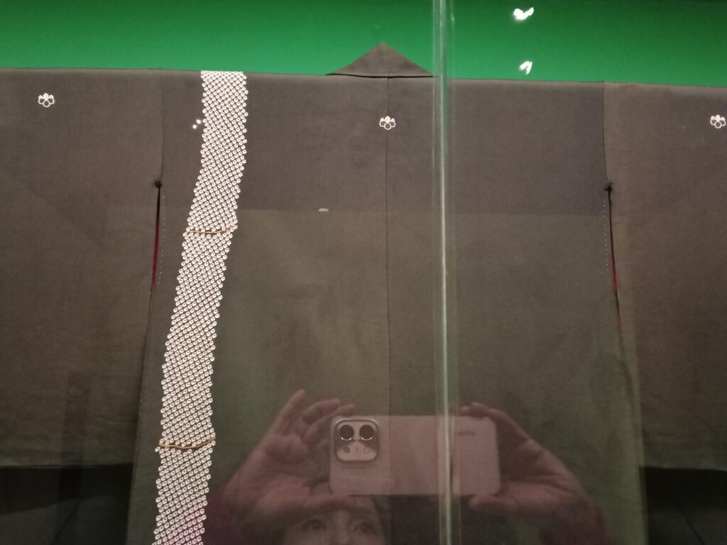 Pero además en las fotos no se ve un último detalle que te quiero platicar. En la mera orilla de mangas y 裾 (suso), hay un hilo blanco de puntadas largas y visibles. A este hilo se le llama しつけ糸 (shitsuke-ito). Se ponen en kimonos nuevos (o recién limpiados) para mantener la forma, para que no se deforme en el guardado ni se muevan los pliegues. Normalmente se quitan justo antes de usar el kimono. Se le dejan esos hilos a muchos kimonos que están en exhibición para que el kimono conserve su forma.